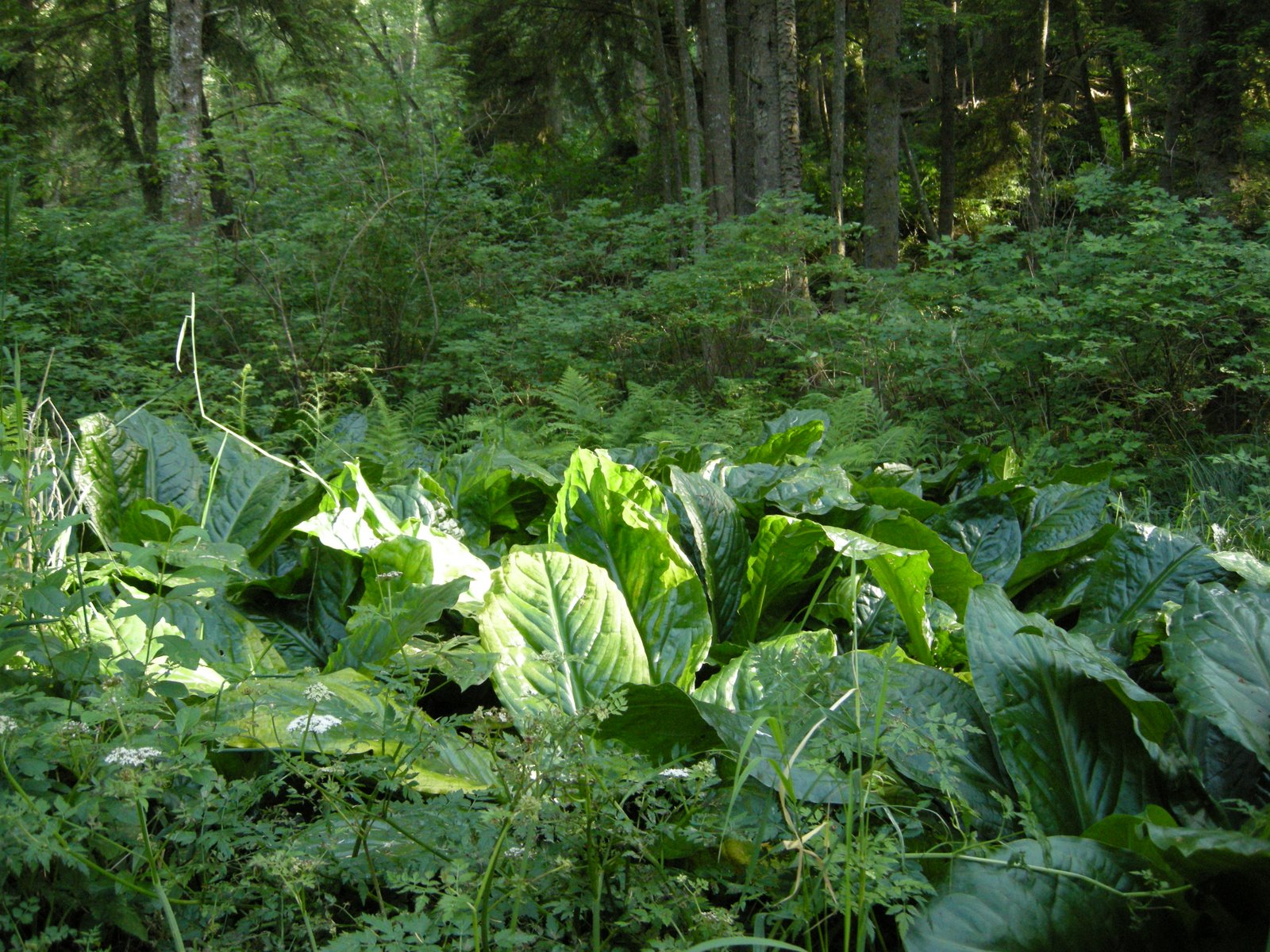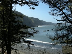 The road that winds along the coast from Sunset Bay to Cape Arago is part of the Pacific Coast trail. The forests are thick and lush with old growth Douglas-fir, spruce, and hemlock, with huge skunk cabbage plants in the streams. At almost every curve in the road a trail disappears into the forest. Openings in the trees reveal the coast in all its glory, with the only view of