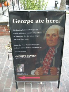 The King Street Trolley is free, traveling from the Metro station stop to the waterfront along the Potomac. We arrived in town and looked for the visitor center. A very nice volunteer told us what not to miss and we decided to follow the self guided walking tour through town. There we saw many highlights, including the restored Torpedo Factory now filled with art studios and working artists. The architecture is amazing, and I took way too many pictures of houses, buildings and street views. I just can’t resist. We took the tour of Gadsby’s Tavern, where George Washington often ate in town when he was visiting from Mt. Vernon. Later, we walked past his townhouse just up the street from the tavern. Christ Church was especially lovely, where I sat in GW’s pew, near a little plaque with Eleanor Roosevelt’s name marking her position when she visited that church. Almost every president has worshipped here at one time or another.