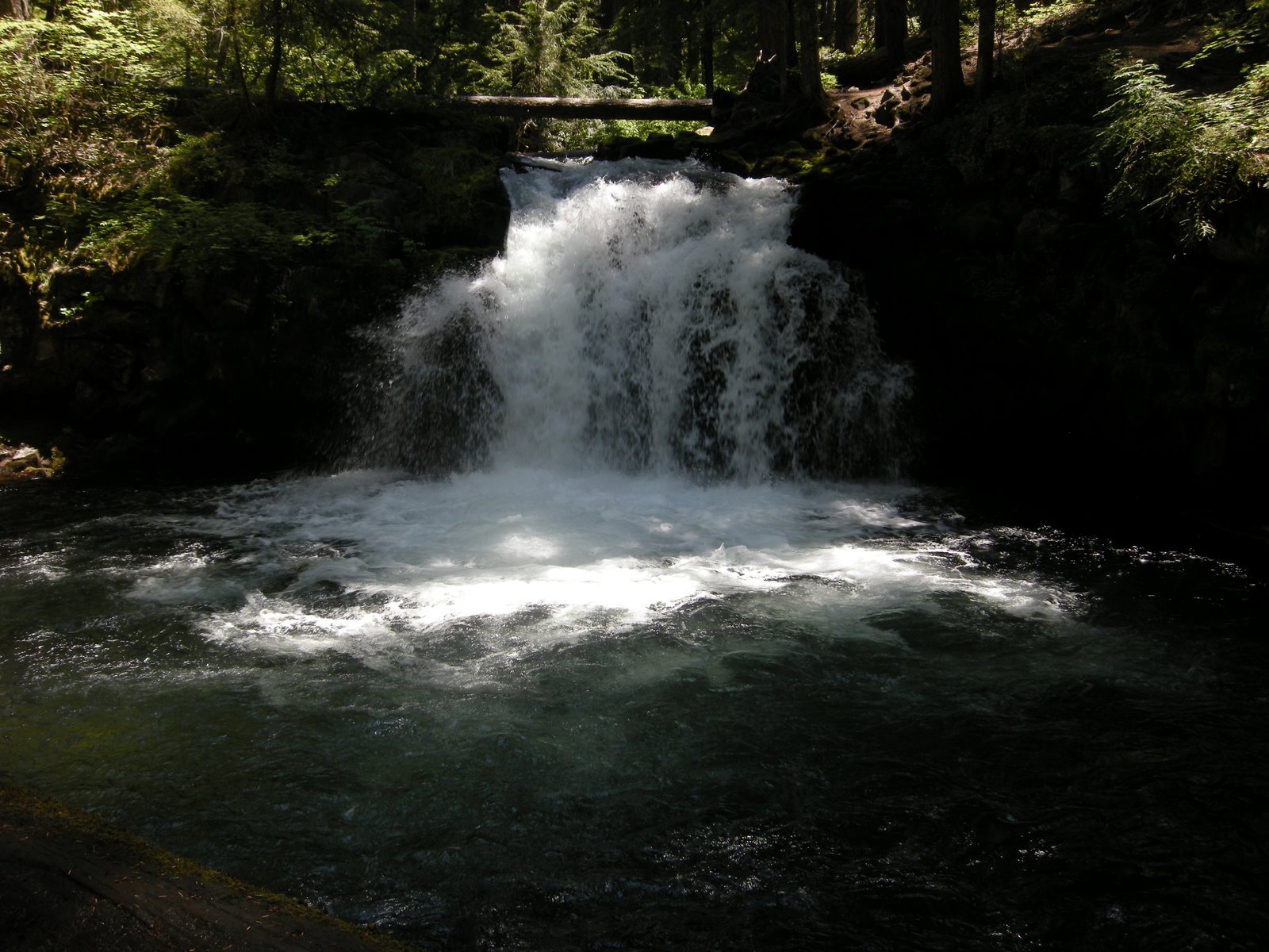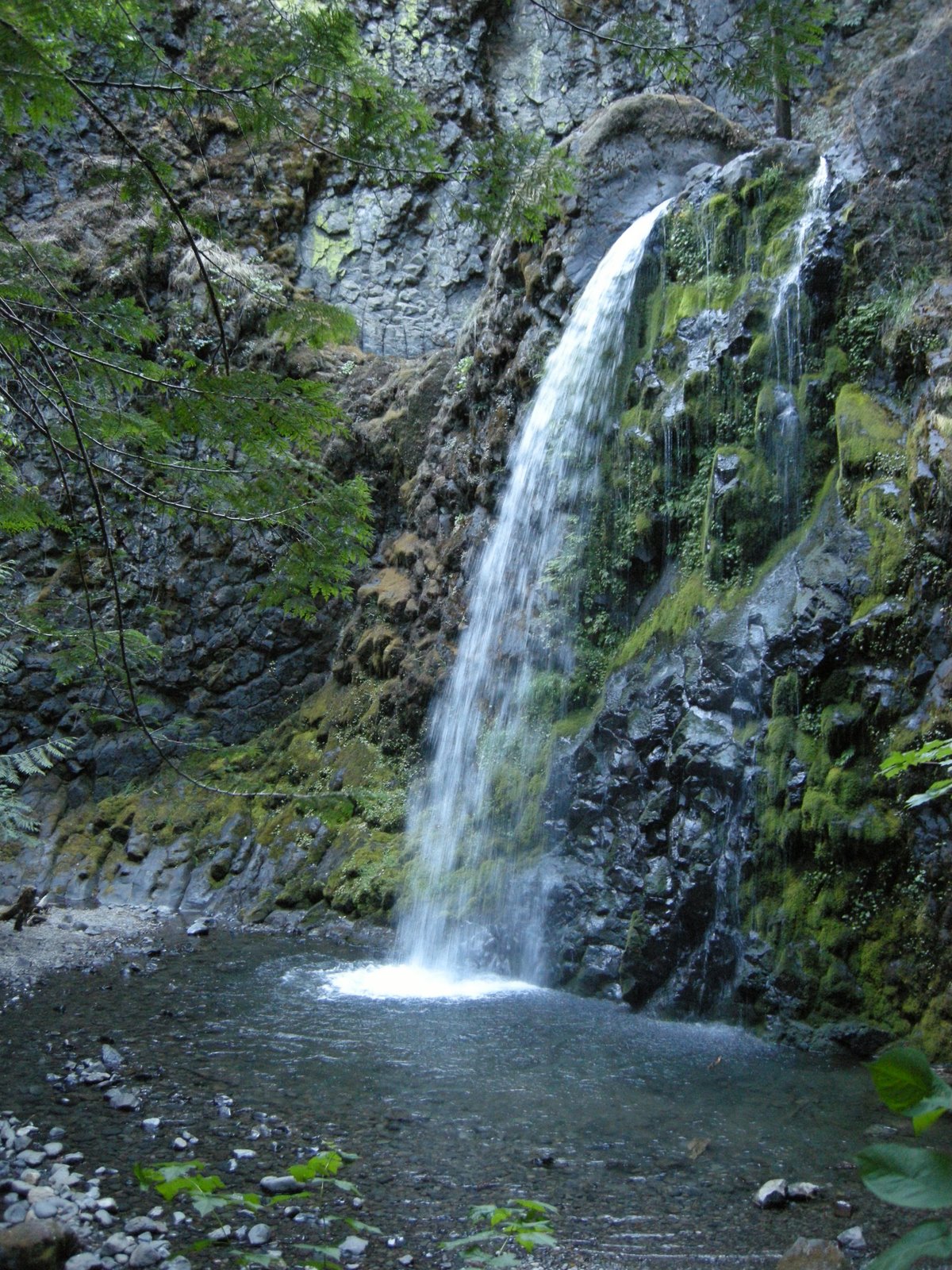 Traveling east on HWY 138 almost to Diamond Lake, the first waterfall we saw was Clearwater Falls. Just a short walk from the parking lot, the falls rumbles and tumbles over dark green moss covered stones. The rhododendrons were still blooming and the mist was cool and refreshing. Hiking to the top of the falls revealed a calm quiet pool above where Abby could swim but the water was very cold.