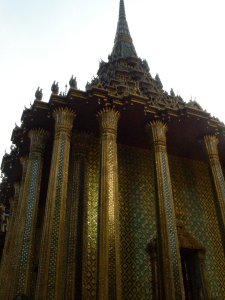 Everything soars upward, the chedis (where relics of the Buddha are held, the prangs which guard the grounds and even the buildings, everything requires that you look “up”. The ‘bat’ holds the sacred emerald Buddha, but the jade sculpture was so surrounded by complexity that you could barely see it. I sat on the floor with some Thai girl scouts and thought of my friend Shera who passed early this year and eased her passing with Buddhism.