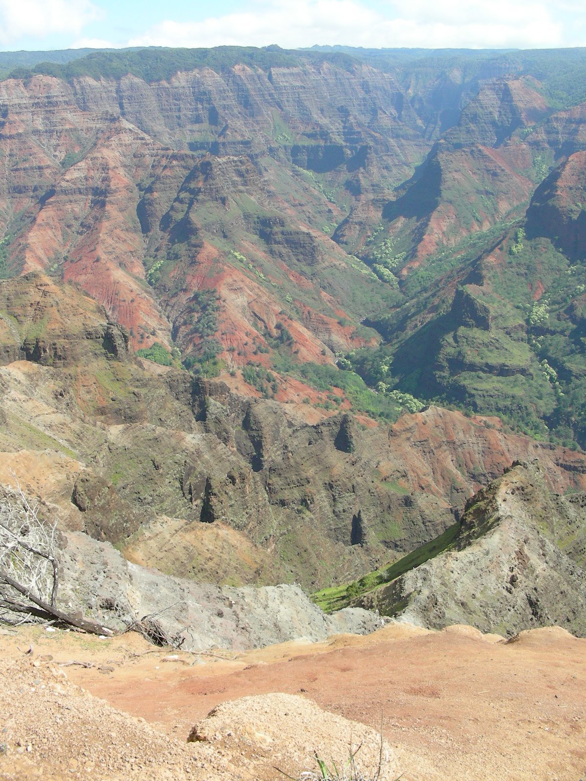 The road goes up very fast, from sea level to 1500 feet in about 2 miles and then it settles down to a bit more reasonable elevation. There are several wide spots in the road for views, and the main lookouts are marked well with parking and of course, lots of people. We were glad to have stopped at one of the earlier unmarked areas for the first view of the canyon because we had the dramatic run of a herd of wild goats running along the cliff sides. Of course, the telephoto on my camera works great, but I can’t seen anything in the viewfinder in the bright sunlight so I have a closeup of some very pretty rocks, and no goats. But we at least got to see them. On up the canyon, we stopped at each of the bigger viewpoints, including the main Waimea Canyon Lookout where I bought fresh pineapple (a hit) and ice cold coconut floating in coconut water (a miss). We also stopped at the Pu’u Ka Pele and the Pu’u Hinahina Lookouts where you can see the lovely Waipo’o Falls in the canyon and the forbidden island of NiHau in the west. We got much better views of Nihau later in the day but it was fun to see it from the high point of the canyon drive.