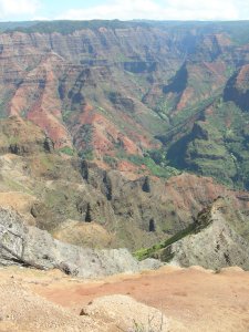 After seeing the south and east side of the island on our first day out, we decided that today we wanted to see the famous Waimea Canyon, Grand Canyon of the Pacific, as it is referred to. Our typical granola and banana breakfast and we were on the road by 8 am, traveling south on 56 and then west on 50 through the towns of Hanapepe, which we saved for another trip, and Waimea, and up Canyon Road. Interesting that the road to the canyon isn’t well marked because the powers that be actually want you to miss it so that you will continue on to the next town of Kekaha to hopefully spend some more money before continuing up this other route to the canyons. We had our trusty guidebook which warned us of this little problem, so even though we also missed the turn, we knew enough to turn around and fine the hidden turn.