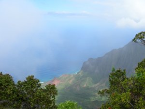 As we drove higher, over 3500 feet, the fog started coming in and the views lessened. We drove past the Koke’e State Park and on to the end of the road and the two lookouts that give views off the Kalalau valley and those famous vertical green cliffs and the Pacific Ocean. The road wasn’t as potholed as suggested in the guidebook, but the clouds were there and the views were not. Ah well. I looked at the photos and imagined what I might see if my timing were better. There are several trails that take off from the last viewpoint, including the Pihea Trail and the Alaka’i Swamp Trail. All trails that would have beckoned us another time, but on this day our legs were still complaining about what we did yesterday on the Kalalau trail so we looked at each other and said, “Hey, who needs to hike in the fog, we couldn’t see anything anyway. Let’s go find a beach”.