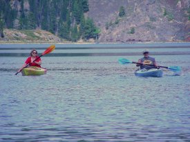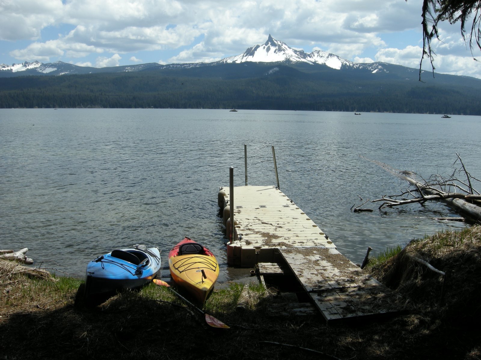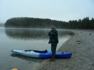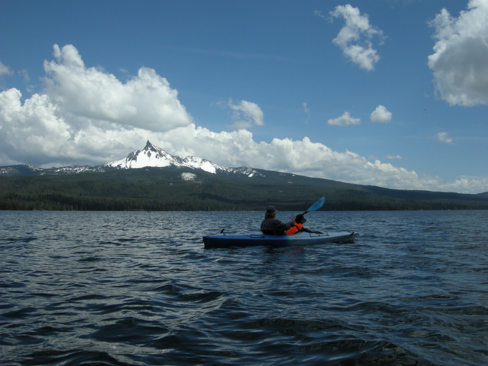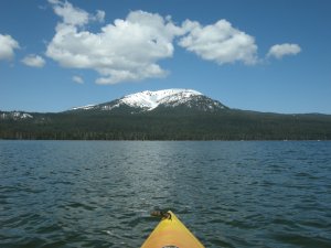 After breakfast we decided that maybe kayaking in the morning would be better, and drove to the south shore of the lake and found a put-in spot just south of the Diamond Lake campground. It was cool so we parked in the shade and let Abby wait in the car this time. Kayaking with a restless dog is ok sometimes, but not for the long ride we looked forward to this morning.