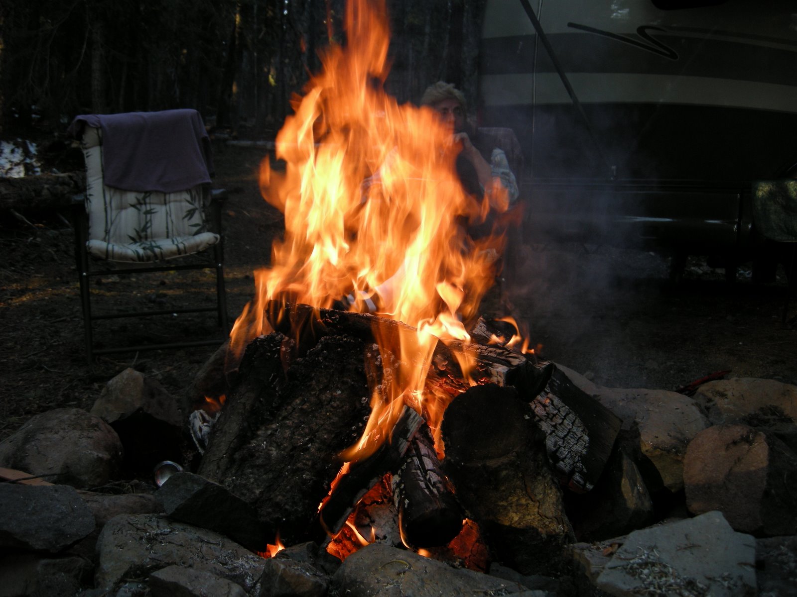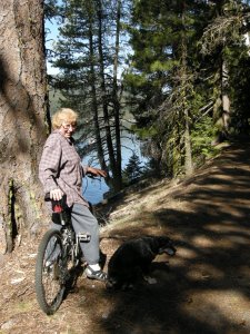 Home for a late lunch around 2, a bit of a rest, and then time to try the biking thing with Abby again. The trail around the lake is really amazing, so we decided to try it from this end of the lake along the east shore. It was a bit of a challenge this time, because Abby was all excited and wasn’t quite as easy to manage on the bike, but after a bit she settled down and is getting the hang of leading ahead of the bike without pulling. Sometimes she would get excited and think about chasing a squirrel or something, but overall she was good. We biked a couple of hours, enjoying especially the quieter parts of the trail where the campground was still closed. In spite of Abby’s new skills accompanying the bikes, my shoulders were pretty sore from trying to hold on to the handle bars and the dog as well. Hopefully it will get better as time goes on. The other thing that gets a bit dicey is coming upon other dogs in the biking situation, especially if they are not leashed. But so far, no real problems. When we finally did ride up to the MoHo it was with a bit of relief and both of us were pretty happy to be settling in for a campfire, a couple of brats and buns, and a nice evening.