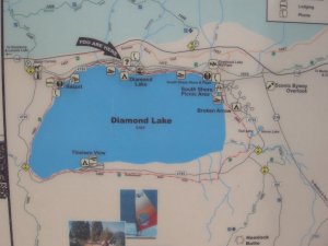 After packing up to leave, we opted for breakfast at the Diamond Lake Resort cafe, with a great view of the lake. The resort is quite nice, with motel rooms, cabins, a marina with lots of rental water craft, and a well stocked little store, and a couple of restaurants.