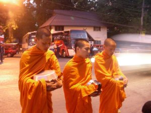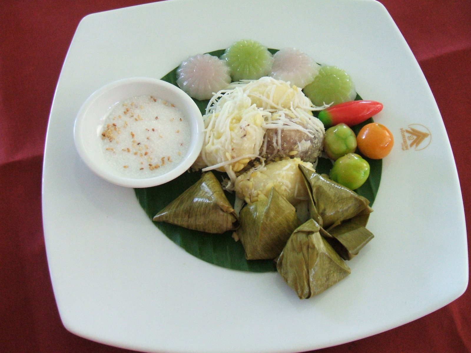 The pyramid cakes are made from a paste that is kind of grayish purple, a bit like poi, but made from sticky rice flour and palm sugar, about half as sweet as american sugar. You brush oil on a perfectly cut banana leaf, form a patty of the paste, put in a spoonful of shredded deep fried coconut that has some kind of other stuff in it, and then wrap it perfectly with specific folds that end up in a perfectly folded little package. Amazing. They are then steamed for 15 minutes and served up warm for dessert or saved for the next mornings offerings to the monks.