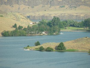What a difference a day makes, AND! a good night’s sleep. AND a computer that works properly. AND! the allergy medications worn off. Whew! The sun is gorgeous this morning, coming over the brown hills to the east, framed in green locust trees and accented by the blue waters of the John Day River, fat and lazy due to the John Day Dam just west of us here at the mouth of the river. This little campground is a treasure, and we enjoyed this mornings cool breezes, and a good night’s sleep. We didn’t even have to unhook last night, and our site is right on the water. The campground is unassuming, but we look out over the water from our awning side and are on level pavement pull through. In the distance we can see the freeway, the railroad, and the hills around us are punctuated by the brilliant white and graceful windmills. Power and transportation, all right here, and yet so rural and very peaceful.